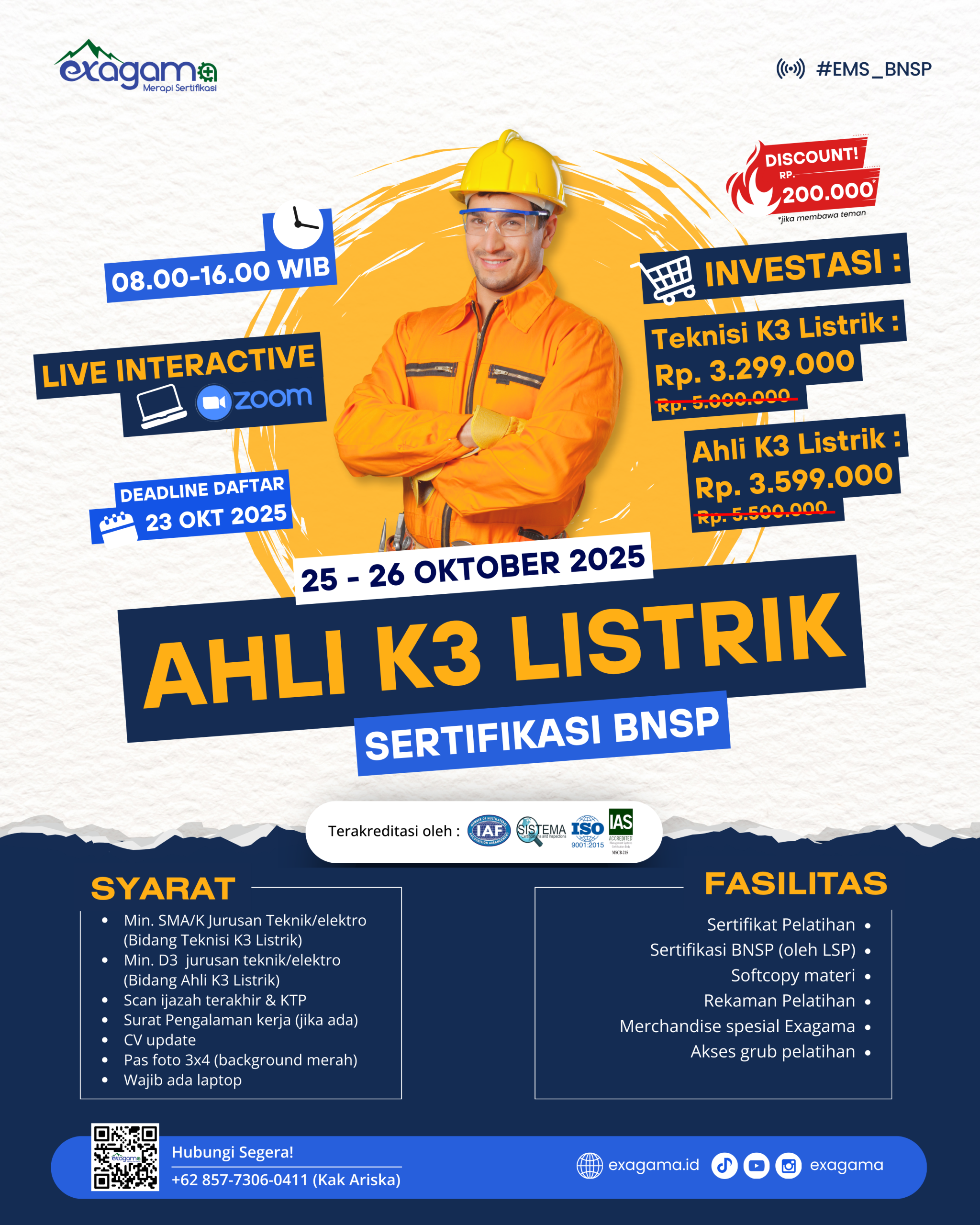 Sertifikat”Ahli K3 Listrik” Sertifikasi BNSP I Lisensi Ahli K3 Listrik | Bonus +++ dari Exagama | Merchandise Exclusive (Baju safety & Waist Bag)