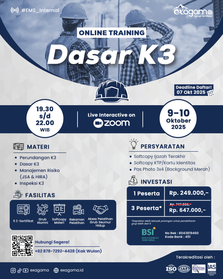 Pelatihan ini bertujuan untuk meningkatkan pengetahuan dan menambah nilai pada CV kamu, sehingga kamu lebih siap dan percaya diri saat melamar pekerjaan. Tapi perlu dipahami ya, Exagama adalah PJK3 yang fokus pada pelatihan dan bukan lembaga penyalur kerja.